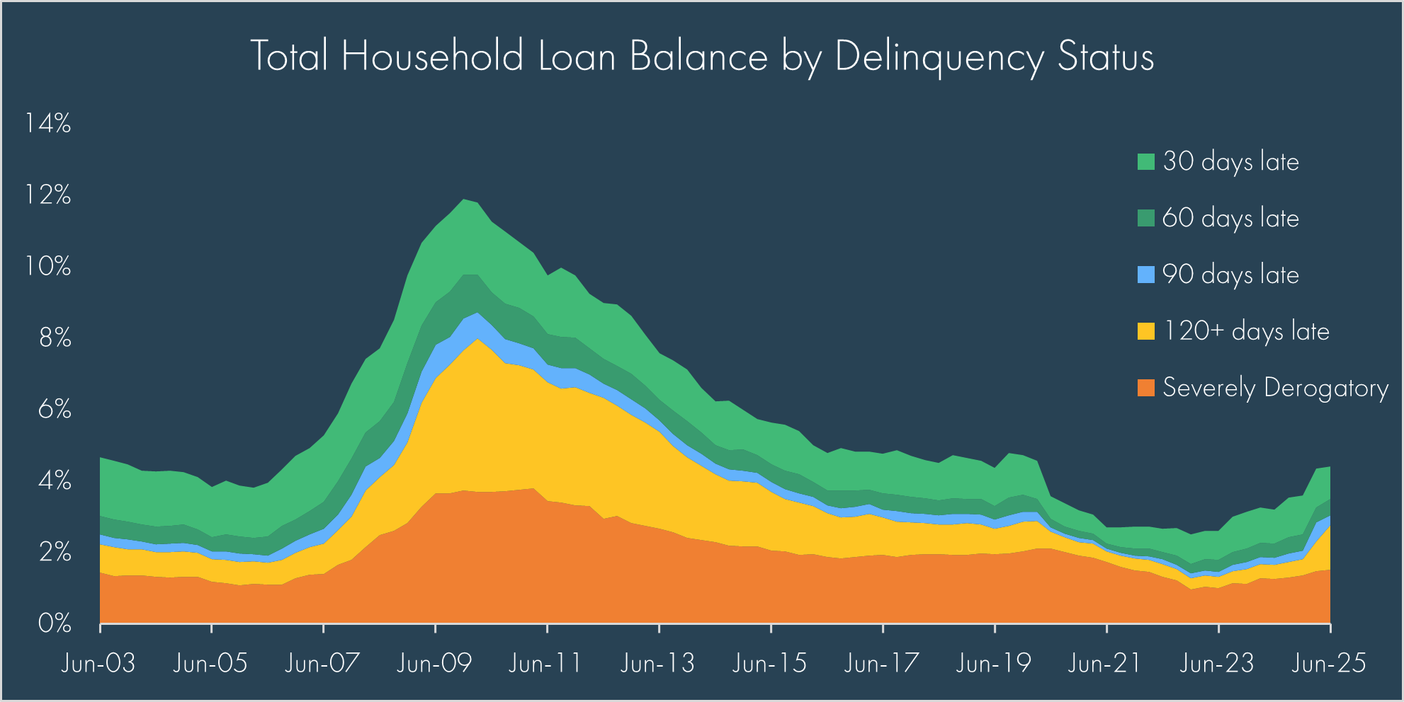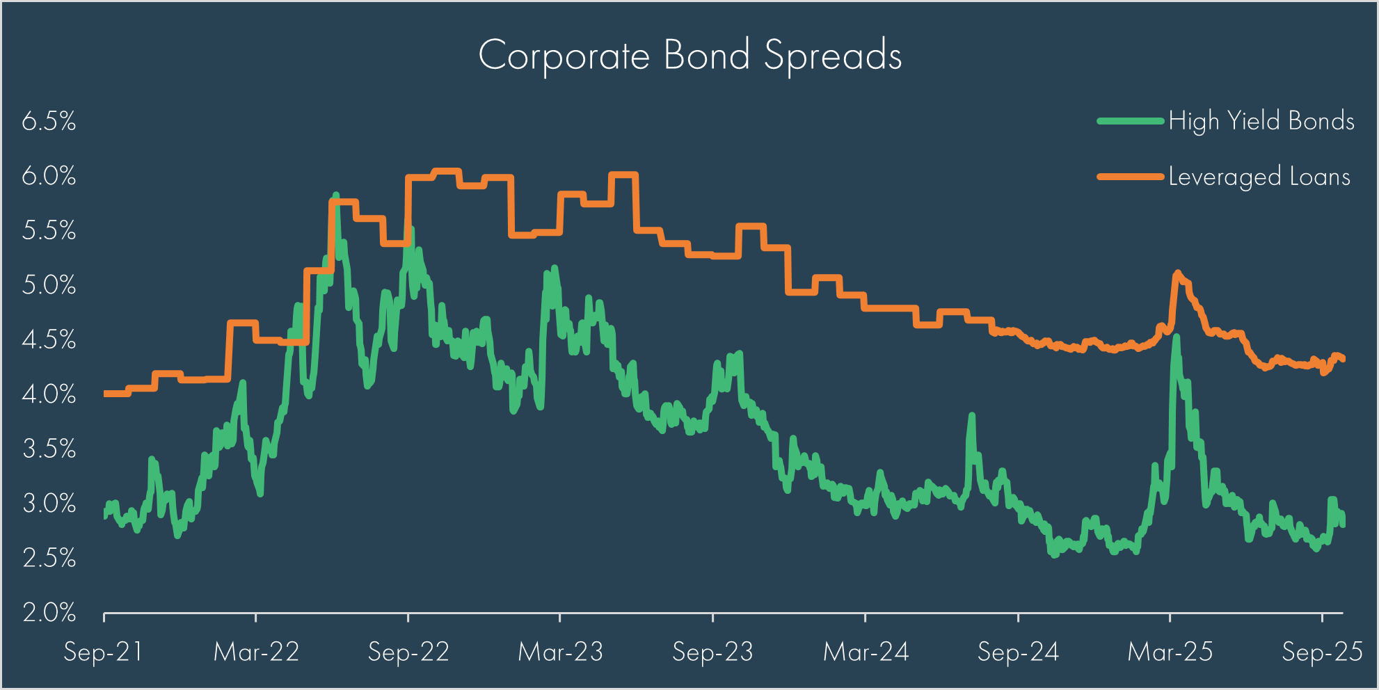 Looking at spreads (the extra yield over risk-free U.S. Treasuries) for high yield borrowers (fixed rate) and leveraged loan borrowers (floating rate), there’s been a slight uptick following the First Brands’ default, but spreads remain near historically tight levels, indicating the market is not pricing in a broader high risk of default for the market. Notably, actual default levels for high yield borrowers remain extremely low (less than 2%) while default levels for leveraged loan borrowers are somewhat elevated (around 3.5%). This is reflective of the higher interest rate environment, which put greater stress on those with floating rate loans relative to fixed rate loans – stress that is likely to subside as interest rates come down.