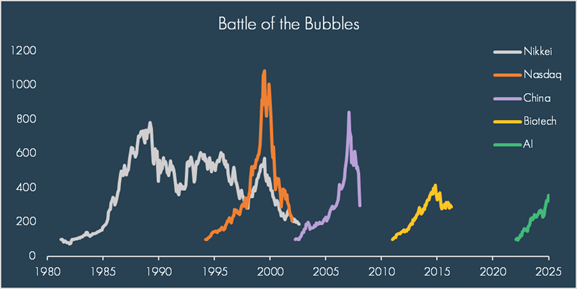 Well, it would certainly seem top of mind today, with Google search interest seeing peak volume for the “AI bubble” topic alongside “sky-high valuations” and “circular spending” concerns for artificial intelligence (AI) focused companies. Add on a high-profile bankruptcy and claims that it’s a “cockroach”[1], it’s natural to wonder whether we’ve reached the end of the AI party.