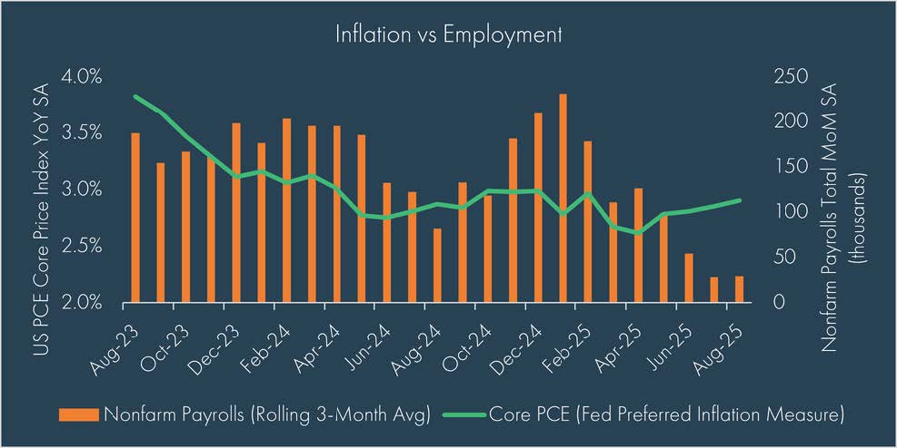 Over the quarter, the Federal Reserve found itself navigating perhaps the most politically charged environment in years. Threats to Fed independence loomed large, yet the institution held its ground, cutting rates by only 25 basis points in September despite political pressure for deeper easing. The move was described as a “risk-management” cut, reflecting greater concern over the softening labor market than the potential risks of higher inflation. One new appointee, Stephen Miran, dissented in favor of a 50-bps cut, underscoring the tension inside the FOMC. While the Fed continues to stress their “data dependent view”, they have currently penciled in two more rate cuts in 2025, aligning with market expectations for a 25-bps cut at their October and December meeting.