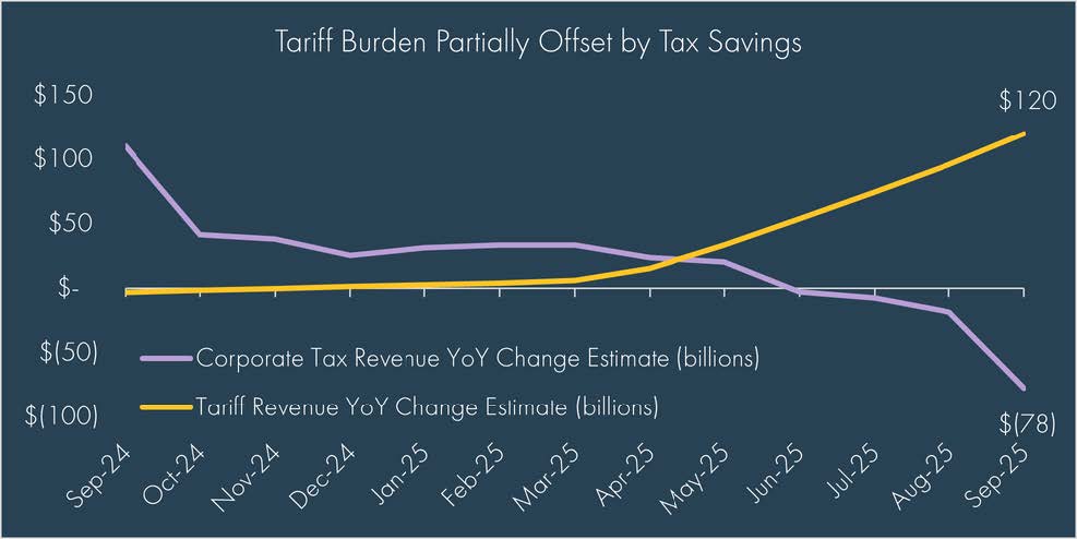 Fiscal policy also added momentum. The One Big Beautiful Bill Act (OBBB), signed into law on July 4th, extended tax cuts and introduced new incentives for businesses and households alike. Federal tax refunds for fiscal 2026 could exceed $500 billion, roughly $150 billion more than last year, potentially adding as much as half a percentage point to GDP growth if spent in 2026. Meanwhile, corporate tax receipts have already declined by an estimated $78 billion over the trailing 12-month period due to expanded tax benefits from the OBBB, partially offsetting the $120 billion increase in tariffs over the same period. While companies have been impacted differently, this dynamic gives investors some insight into how companies have been able to maintain earnings growth despite early indications that they are absorbing most of the tariff costs rather than passing along to consumers.