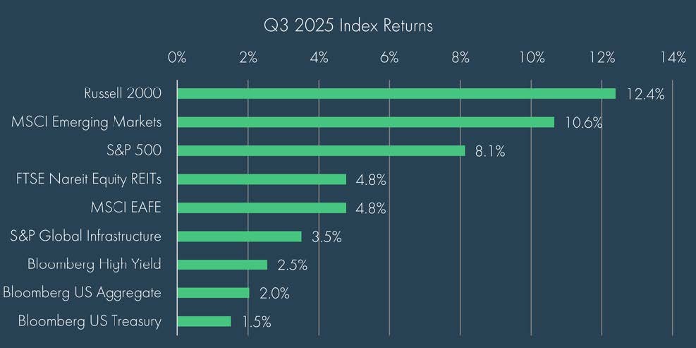 The third quarter of 2025 extended the year’s remarkable market resilience amidst a continuing whirl of policy developments, political tension, and global uncertainty. Beneath the noise, U.S. growth remained exceptional. GDP expanded at a 3.8% annualized pace in Q2, corporate profits held firm, and productivity gains tied to ongoing AI investment helped sustain margins, though valuations across major asset classes remained elevated, leaving little margin for error as markets priced in expectations for continued good news. All told, despite headwinds, 2025 remains a story of resilience across economies, corporations, and investors.